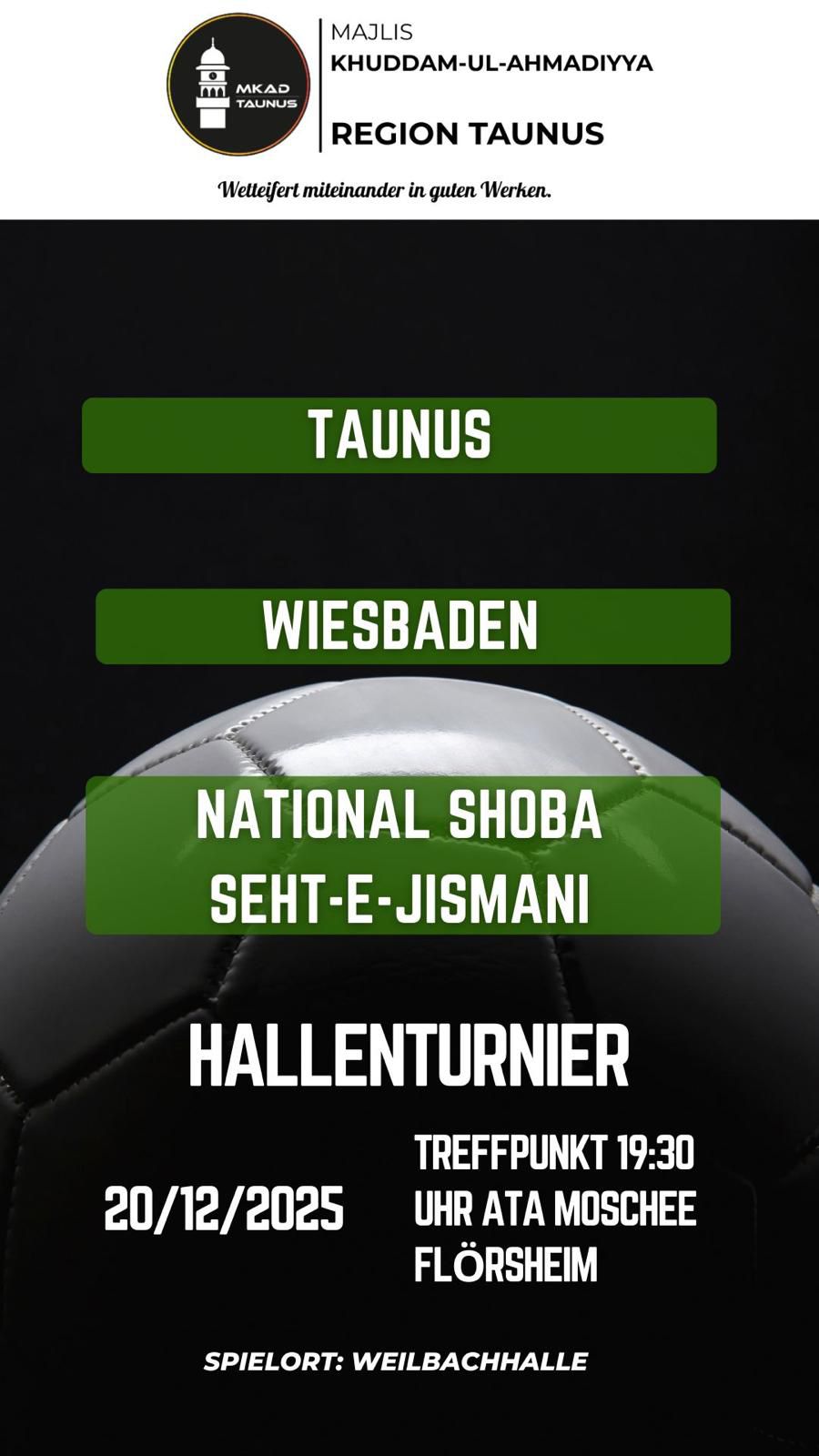 Am 20.12.2025 fand in der Weilbachhalle ein Hallenturnier der Majlis Khuddam-ul-Ahmadiyya Taunus statt. Am Turnier nahmen Taunus, Wiesbaden sowie ein Team der Nationalen Shoba Seht-e-Jismani teil.