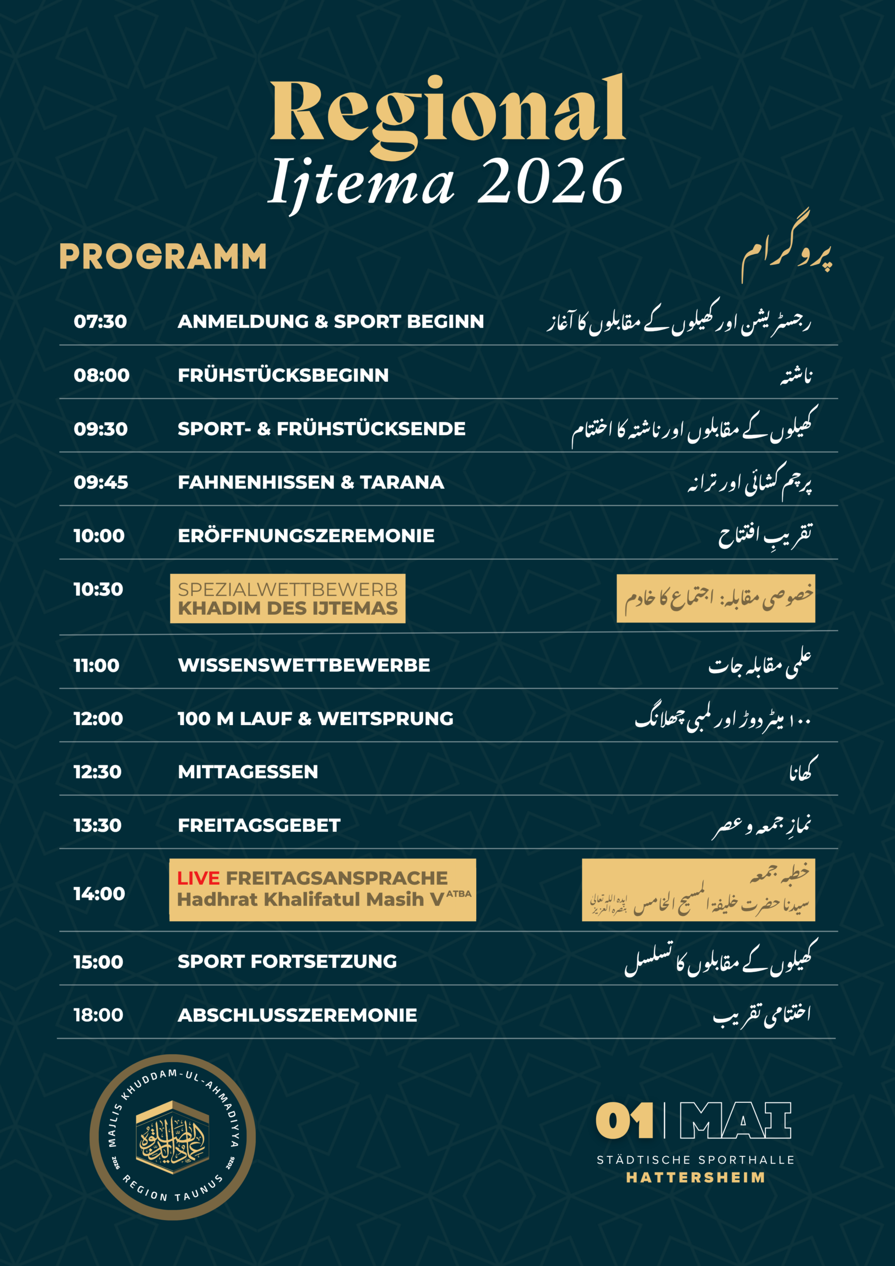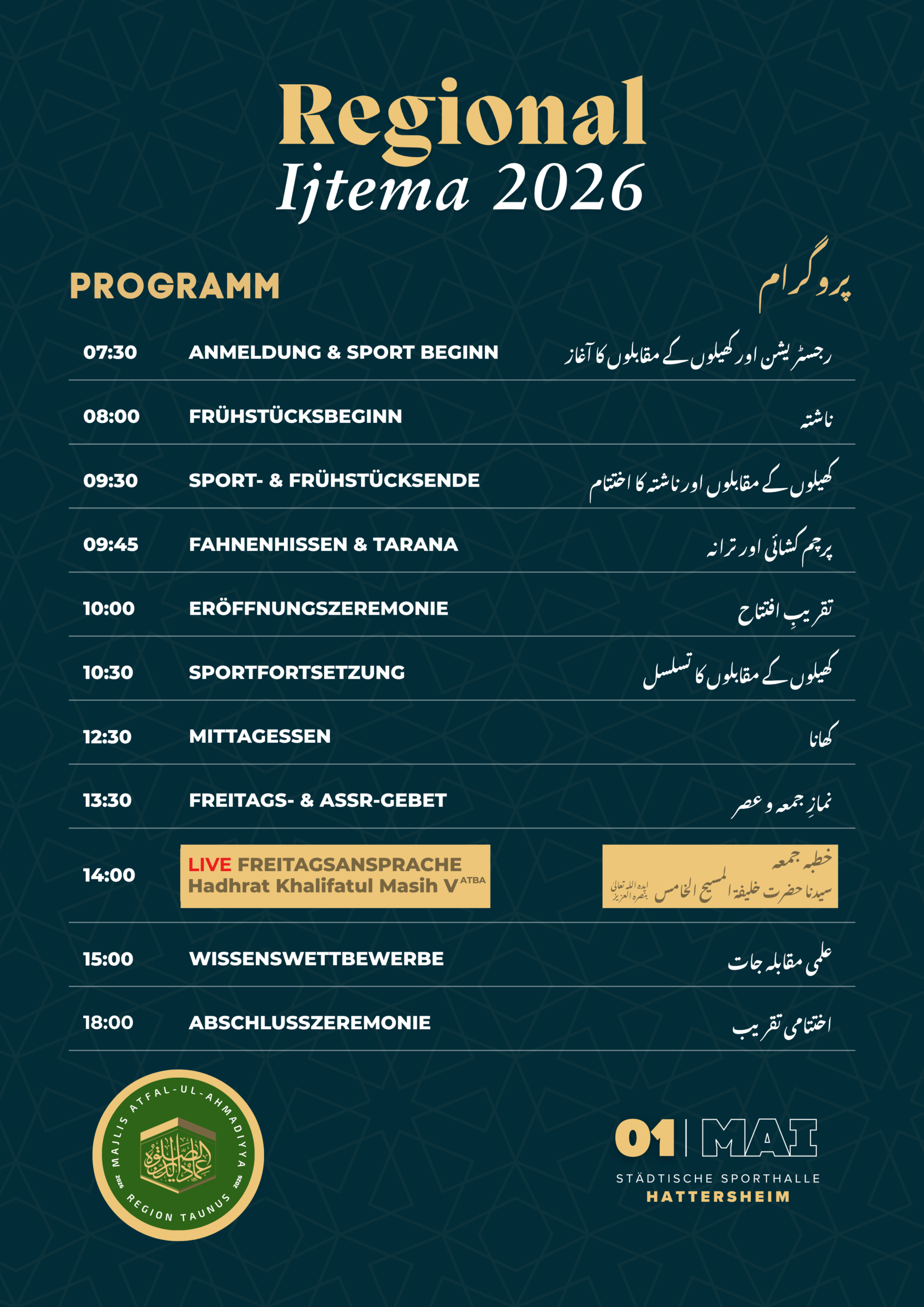 In diesem Jahr wird das Ijtema erneut in der städtischen Sporthalle Hattersheim stattfinden, wo bereits zuvor Regional Ijtema’at abgehalten wurden.