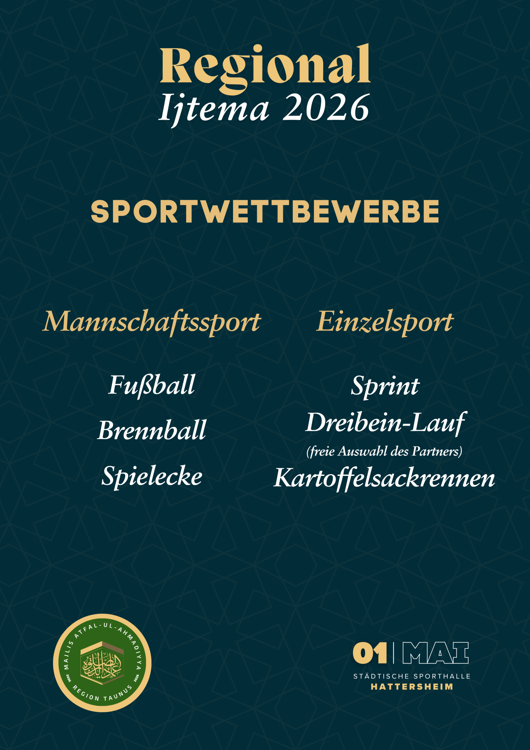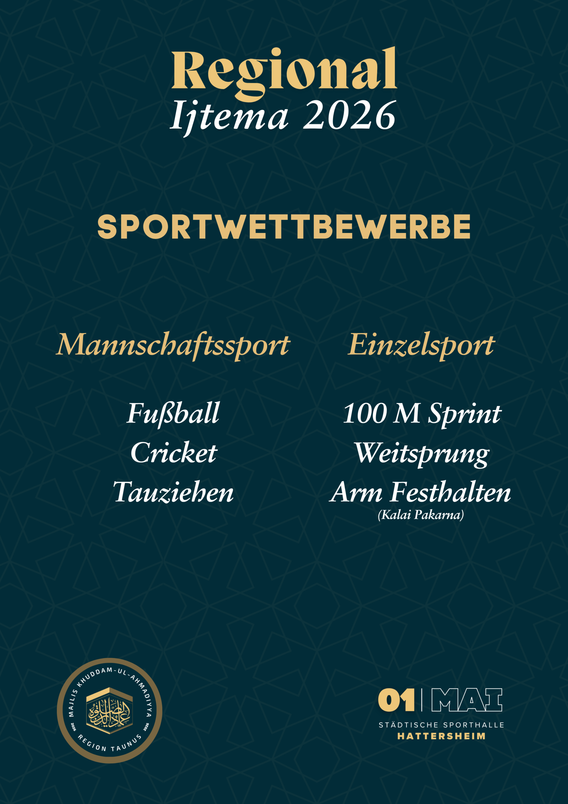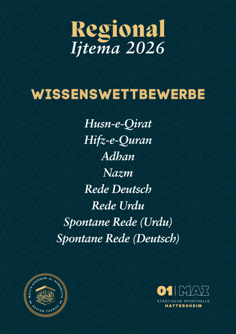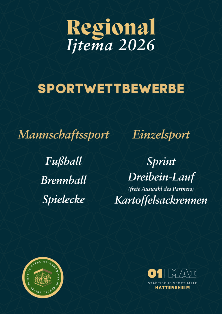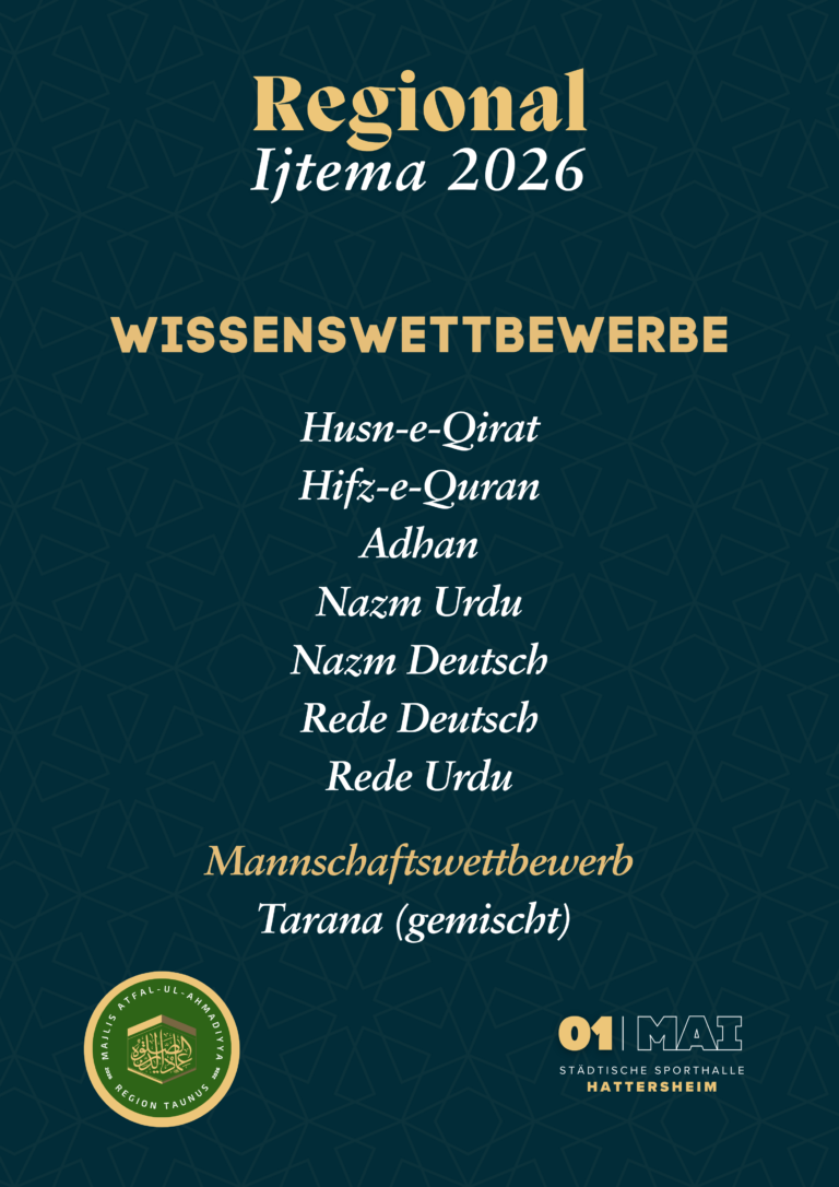 Durch die Gnade Allahs dürfen wir in diesem Jahr erneut an dem 01. Mai unser Regionales Ijtema der Khuddam und Atfal abhalten, insha’Allah!